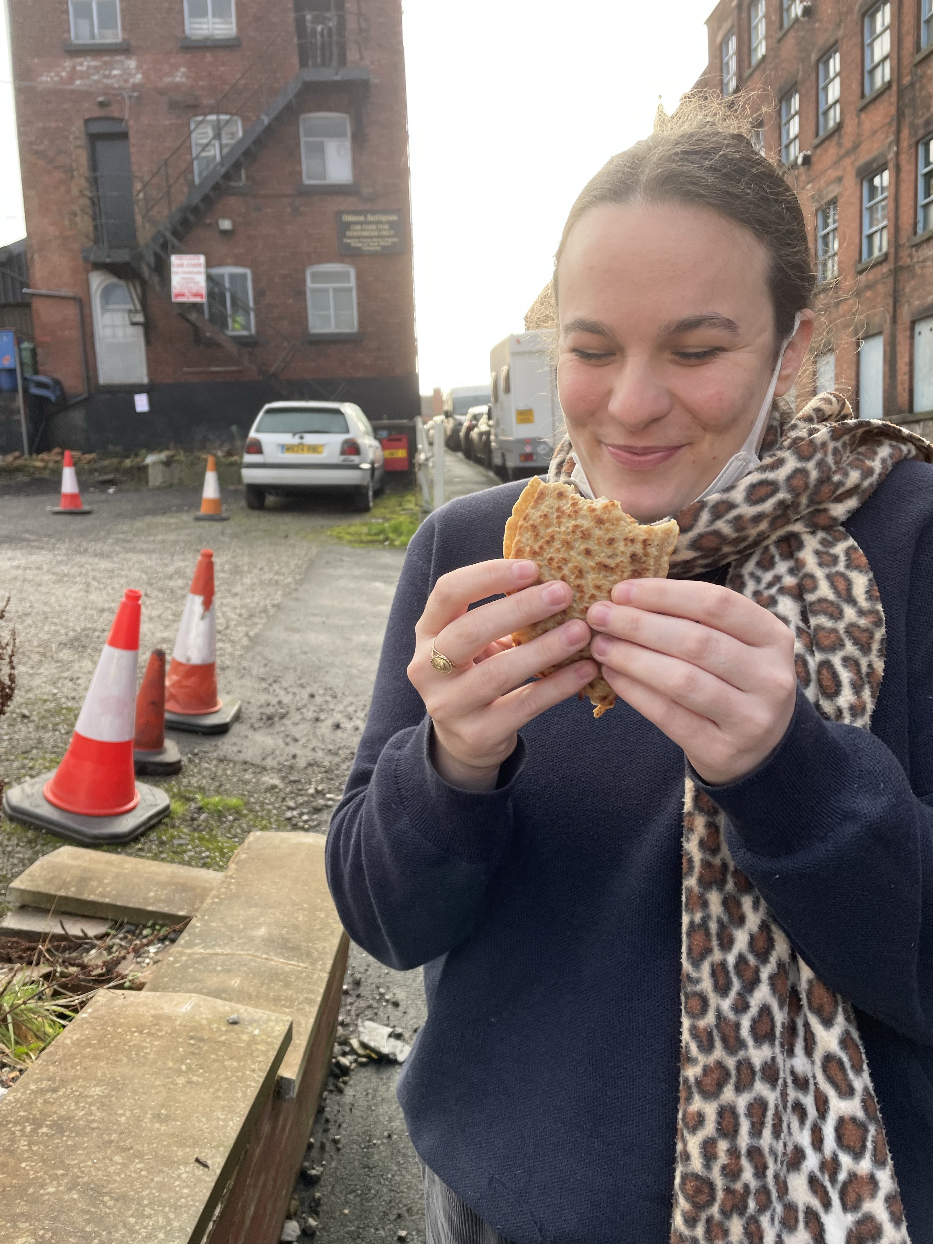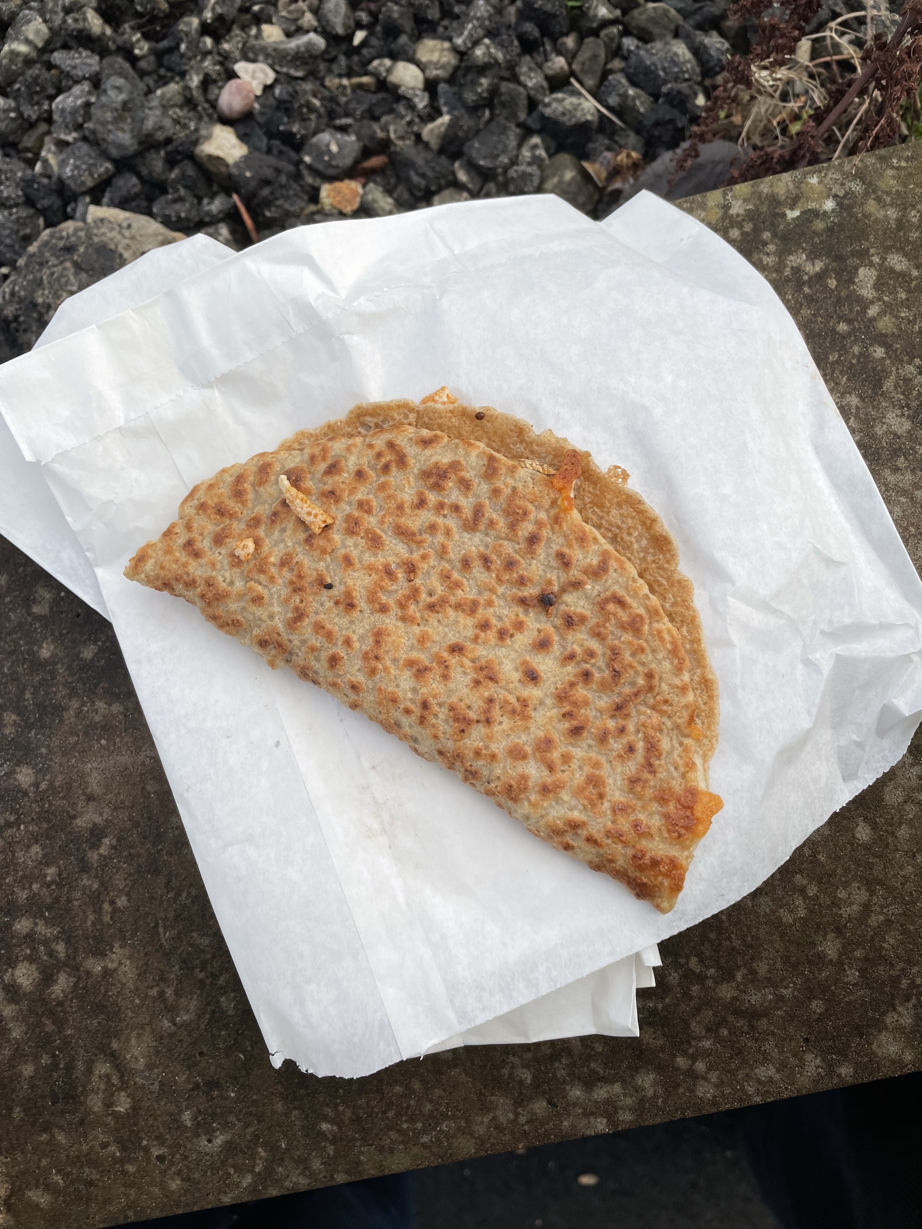 We turned off for a late breakfast at Leek and, just as regret started to seep in at not having stopped at a service centre for bad coffee and chain fare, managed to snag a park near the Leek Oatcake Shop. Covid has reduced the shop to an actual hole-in-the-wall, with the front dining space closed and a steady stream of oatcakes instead being passed out of a door at the side. And I mean steady – in the time we were there, they were serving a customer a minute.