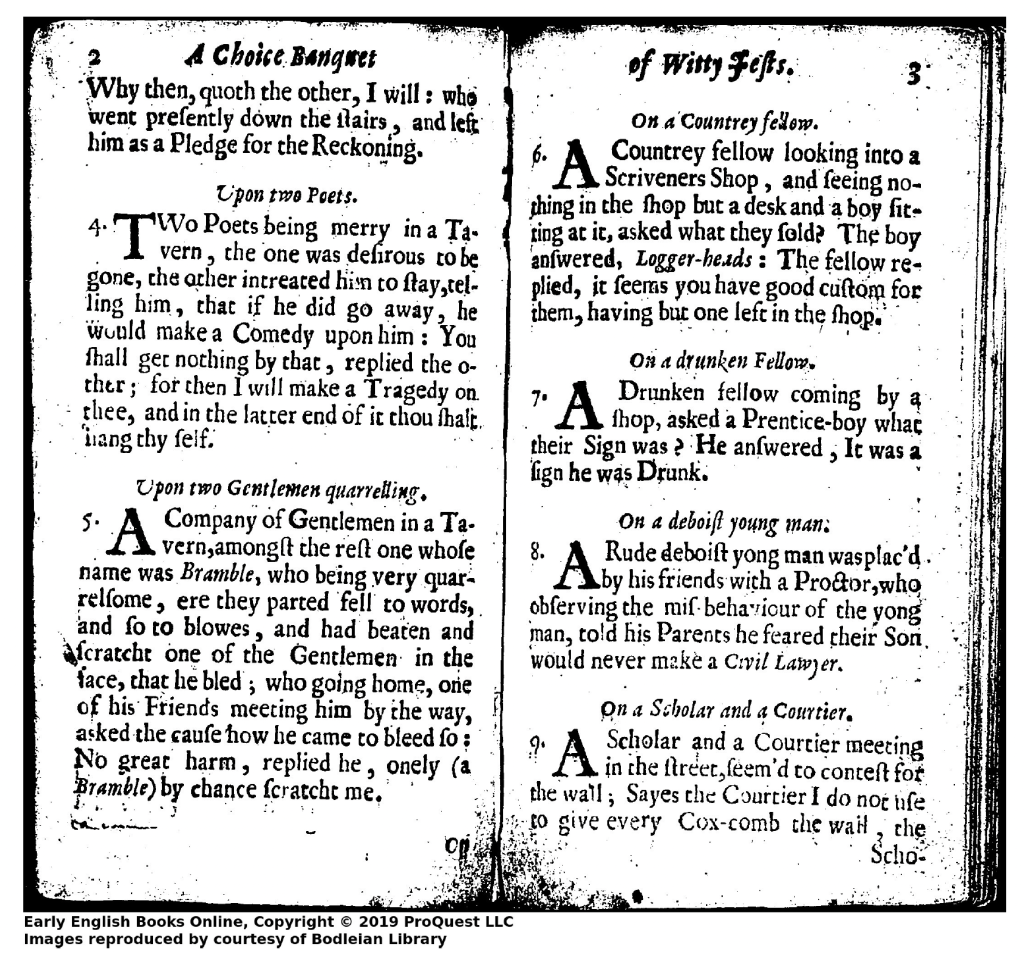 ‘Two poets being merry in a Tavern, the one was desirous to be gone, the other entreated him to stay, telling him, that if he did go away, he would make a Comedy upon him: You shall get nothing by that, replied the other; for then I will make a Tragedy on thee, and in the latter end of it, thou shalt hang thyself.’