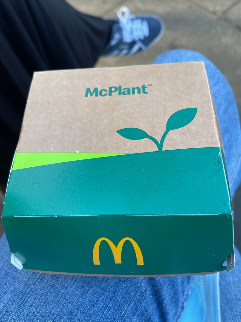 After a giant, oat-milky servo coffee, we stop for McDonald’s at a service centre, to try their McPlant burger, as Lucy fumes at the swathes of unmasked lads at the self-service kiosks. ‘Don’t. Breathe on me. Don’t. Come NEAR me.’ she exclaims, loudly enough to start a kerfuffle. I whisk her out, quick smart, and take a pic of this sad specimen before devouring it. Not bad. Tastes like a cheeseburger.