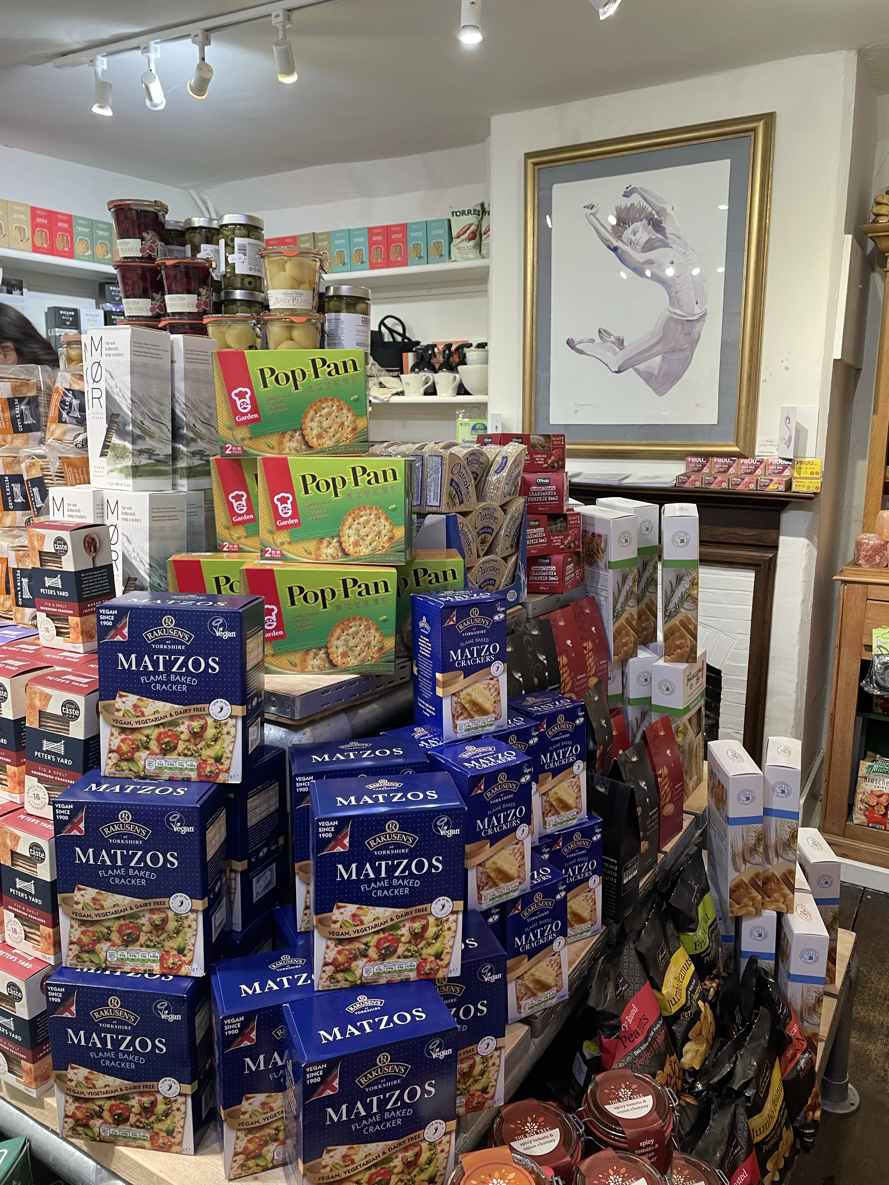 Lucy makes a beeline for Broadway Deli, grabbing cans of olives and truffle-flavoured chips.