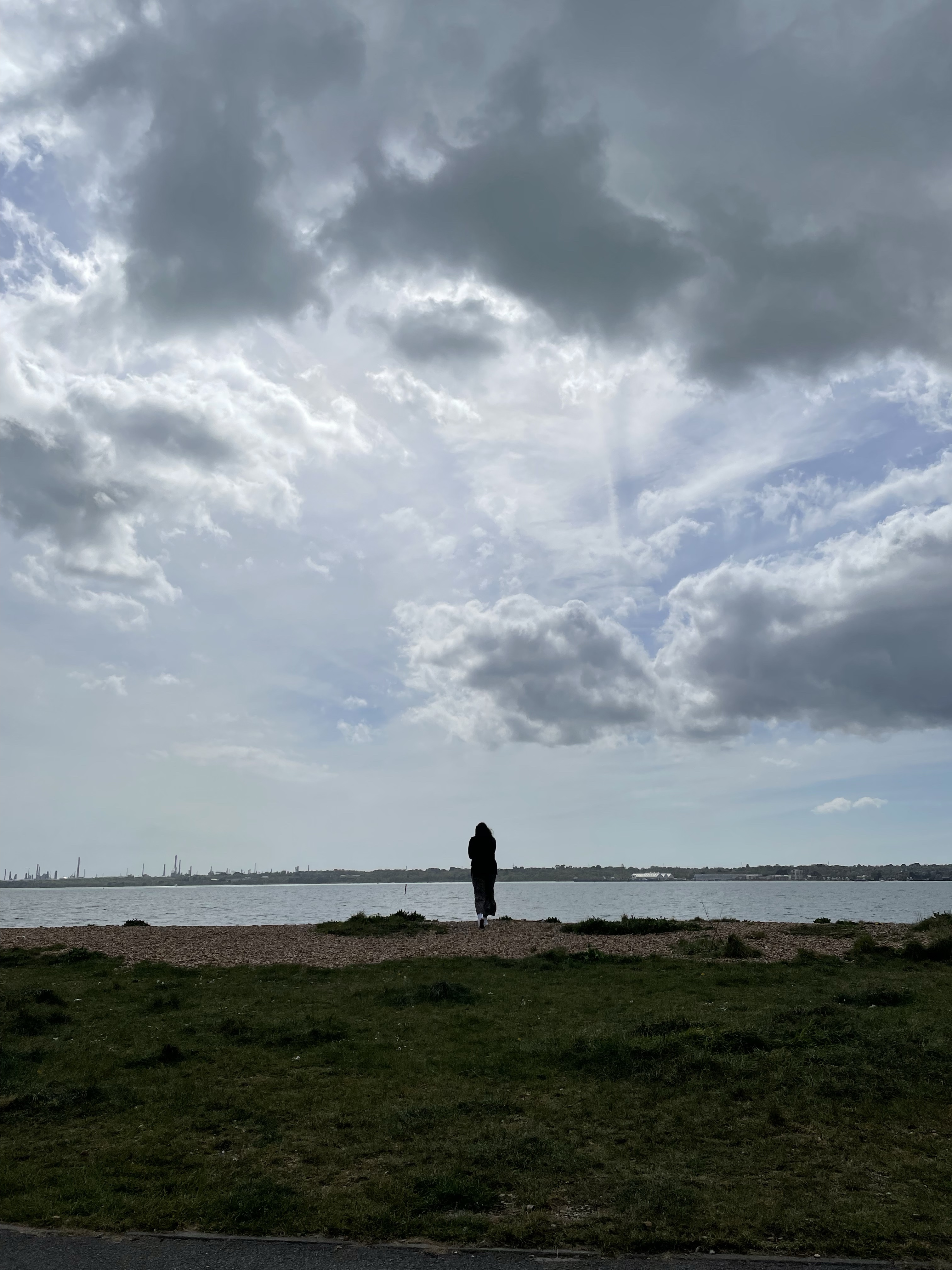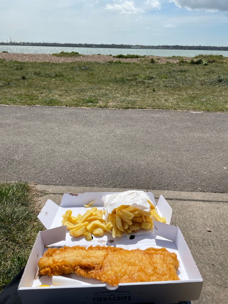 Monday begins at fish-and-chips o’clock. I miss breakfast in anticipation, which is fortunate, given the portion sizes. We balance them on our knees at Weston Shore, and I take this favourite photo of Lucy, outlined on the horizon: