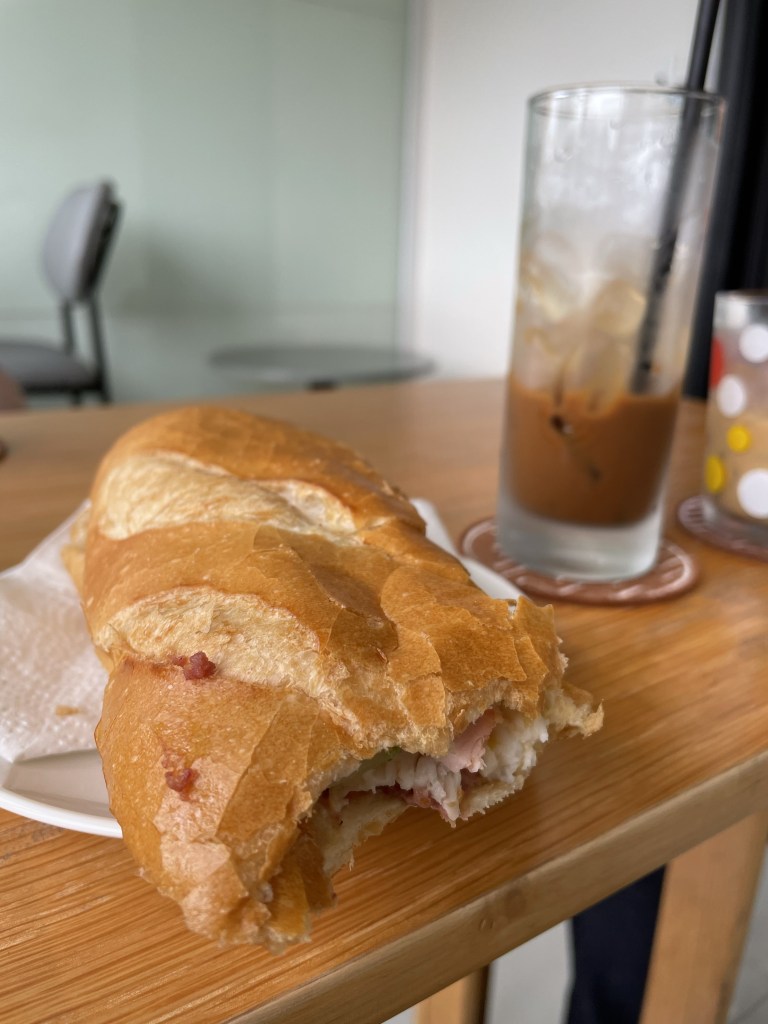 Quynh shows us how not to brew coffee in a phin (‘please taste how not to make it’), then demonstrates what can be achieved with a little finesse and some condensed milk, which isn’t actually milk at all, but a mix of sugar, vegetable oil and milk powder. This produces the standout coffee of the day, pictured here alongside an increasingly-popular, weaker variety, because the youth of today have no guts. We sip it as we enjoy our first bánh mì in Vietnam, served in order to, in Quynh’s own words, ‘tolerate the much cafein we’ll consume’.