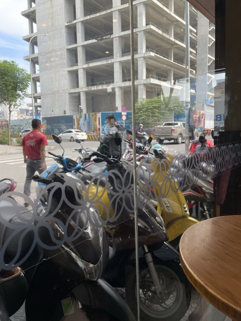 I pre-examine the online menu at Highlands Coffee, the largest chain in Vietnam, and head to their nearest store. A small opening, between scooters, that leads to the entrance door, is so narrow, I almost walk straight past. Thank goodness I don’t – there’s no telling how far I might have walked for the sake of looking natural. At the counter, I know exactly where to point, and am soon sat at a window seat, buzzer at the ready. I busy myself watching an employee in a red shirt whose sole task is to park and retrieve scooters.
