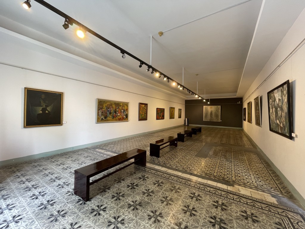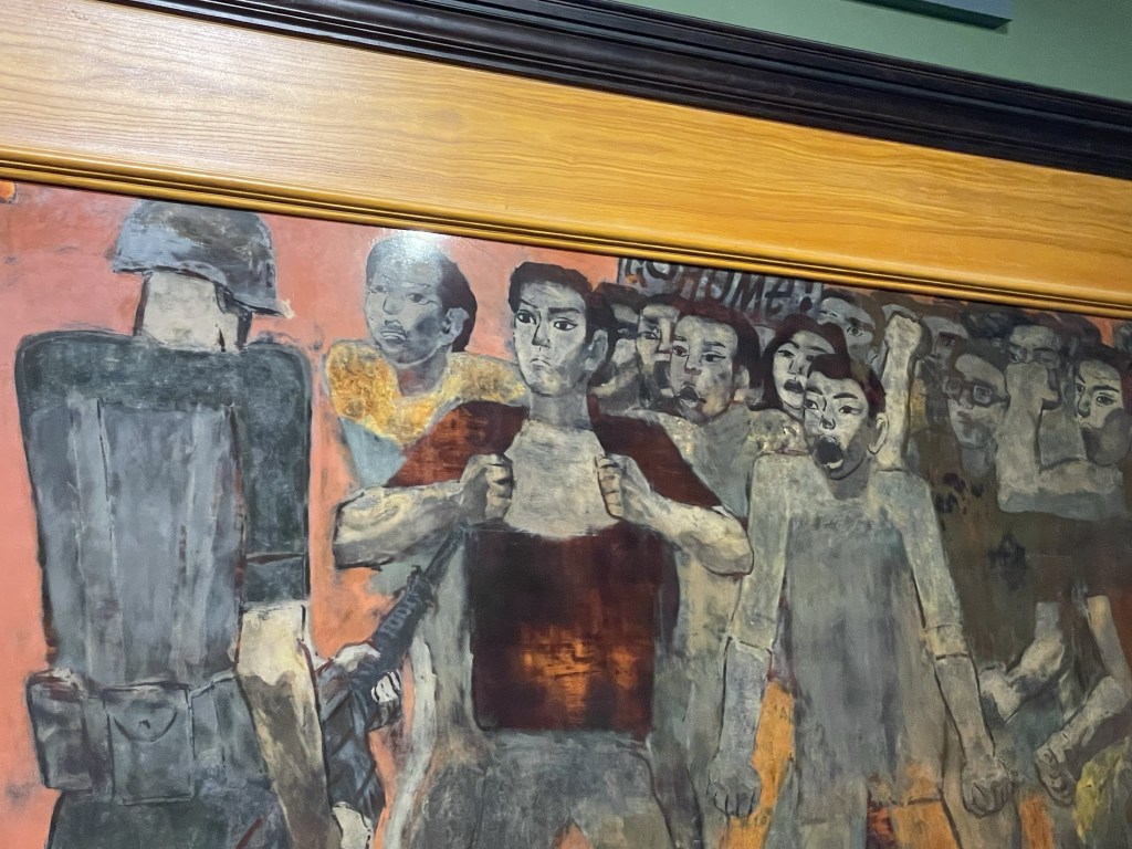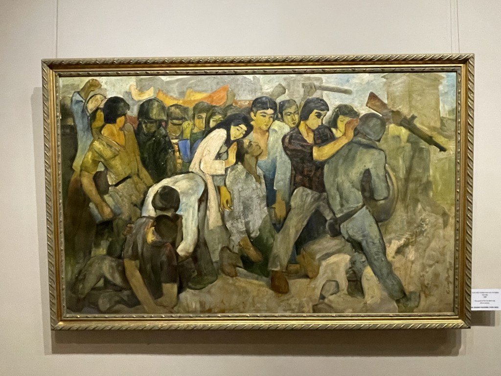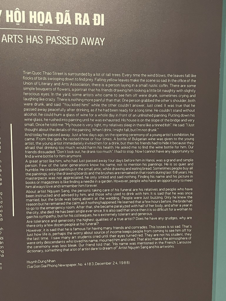 Two rooms have been devoted to Nguyễn Sáng, whose painting ‘Thanh Nien Thanh Dong’ or ‘Youth of the City’ has been declared a National Treasure. It is an arresting painting, and I find myself looking at it for some time. He has painted ‘Go Home!’ on it in English and, I discover later, also in Vietnamese.