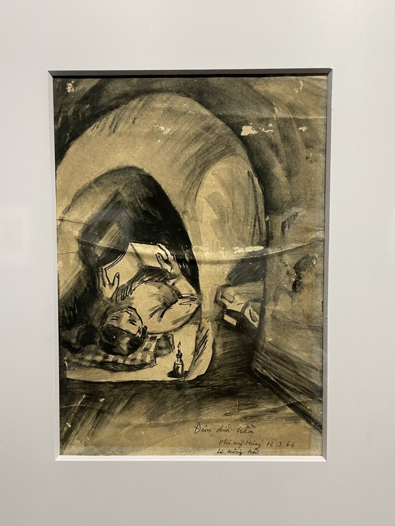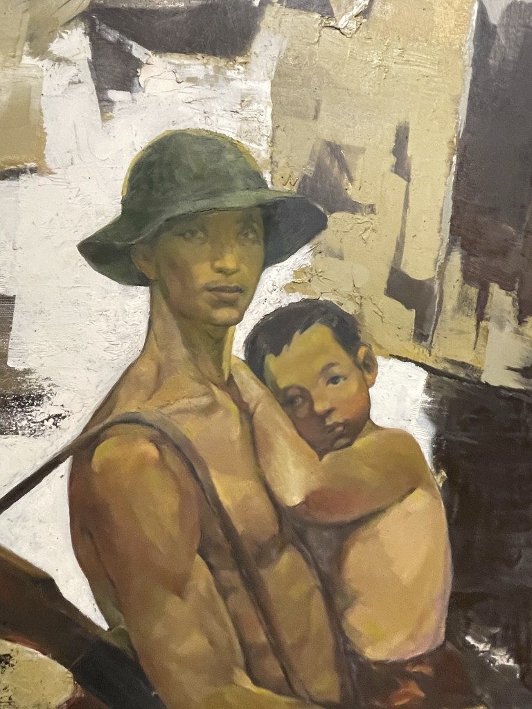 I am so taken with a painting of a Vietnamese soldier holding a child, I circle back to it later, to take a close-up. I will later regret not having taken clearer images of the information panels, to better honour the artist.