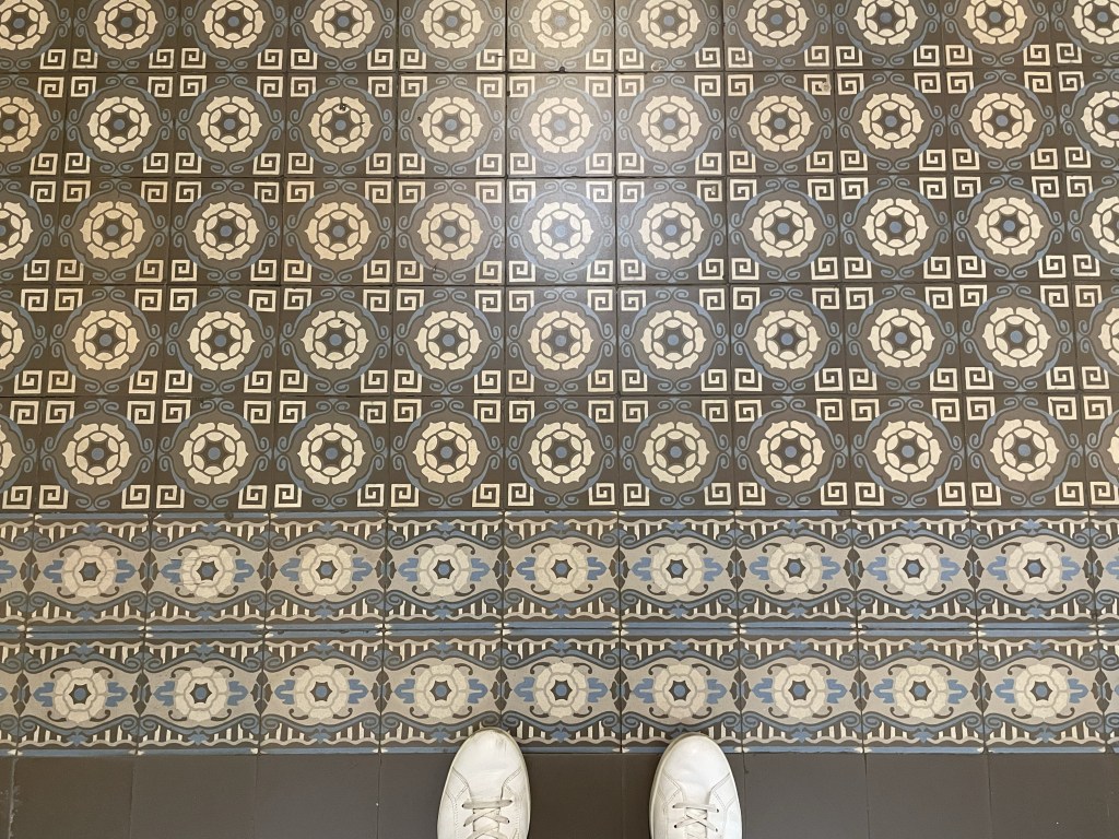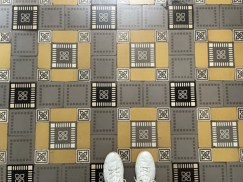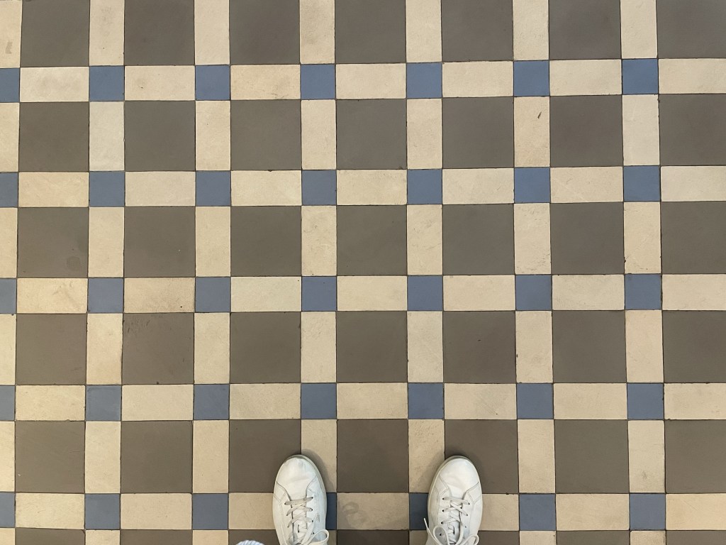 My footsteps herald my arrival, but I am completely alone. Some staircases are blocked by padlocked metal gates, extended across their bases, and cleaning supplies are tucked unexpectedly in alcoves and around corners. Small rooms contain displays-in-waiting, and cabinet glass is marked with a thousand fingerprints. I grow my collection of tile images, brazen in my solitude: