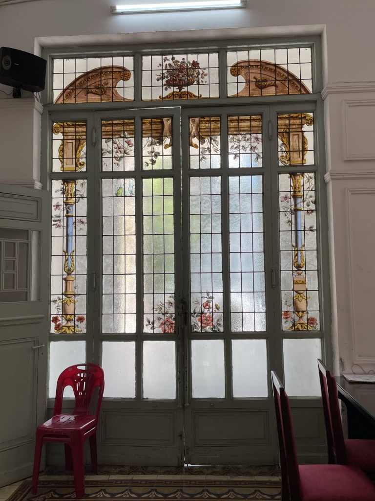 I am enthralled by the high ceilings and stained-glass windows, the French doors, the pillars and cornices, the wrought iron balustrades.