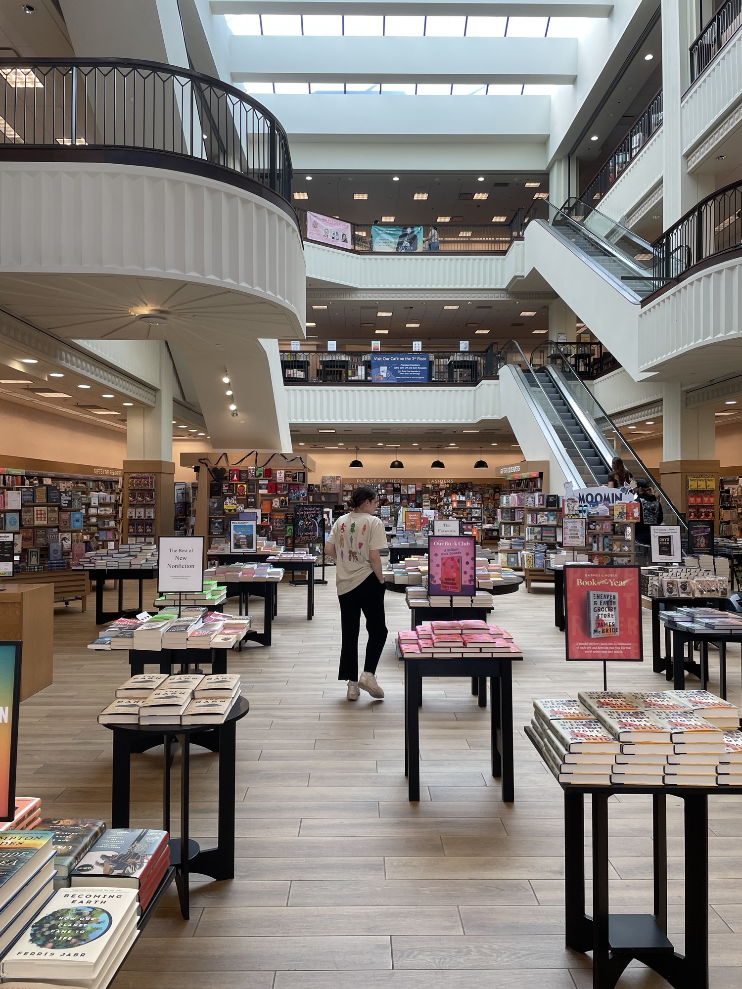 Stop 2: Barnes and Noble, at The Grove. A three-storey ode to quality book stocking, made appealing through the creation of display-table groupings (think ‘FALLing in Love’, for books about love in Autumn). Kitty is the highlight, rushing around with arms full of books, calculating dollars over kilograms. Full disclosure: I pointedly ignore both budgets.
