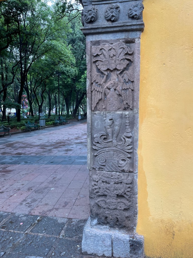 As we head for the car, Citla introduces me to what will be my favourite sight of the day: this stone etching at the entrance to the square. ‘Does it look like an angel?’ she asks, of the shape that has been carved into the stone. I mean…kind of? These are examples of tequitqui, the outcome of the Spaniards entrusting indigenous pupils with the task of creating Christian symbols in colonial Mexico.
