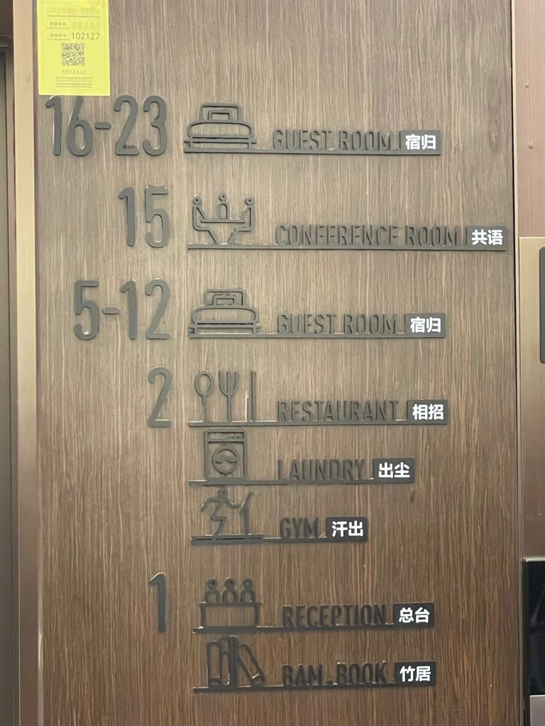 I particularly enjoy seeing characters I recognise, in a context I don’t understand. Look at the way 出 (exit) is used on this hotel facilities sign, for both the laundry and gym.