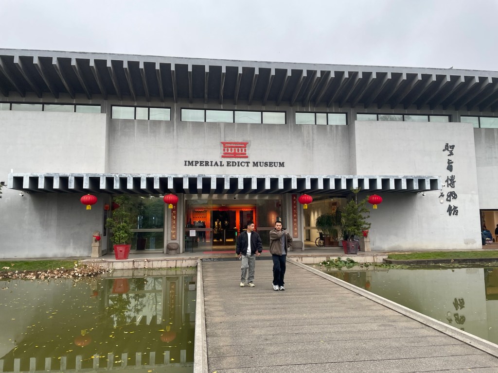 We visit Yùzhào Bówùguǎn (the Imperial Edict Museum), which is the only museum in China dedicated primarily to imperial edicts. It is a beautiful building. We meet the founder and owner of the museum, Zhōu Qìngmíng, who welcomes us warmly and shakes each of our hands.
