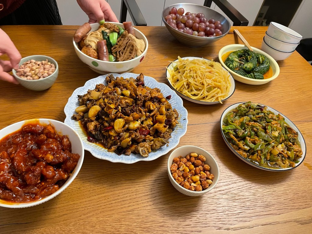 A range of dishes is placed on the table. ‘Bought from a restaurant,’ Mei tells me.